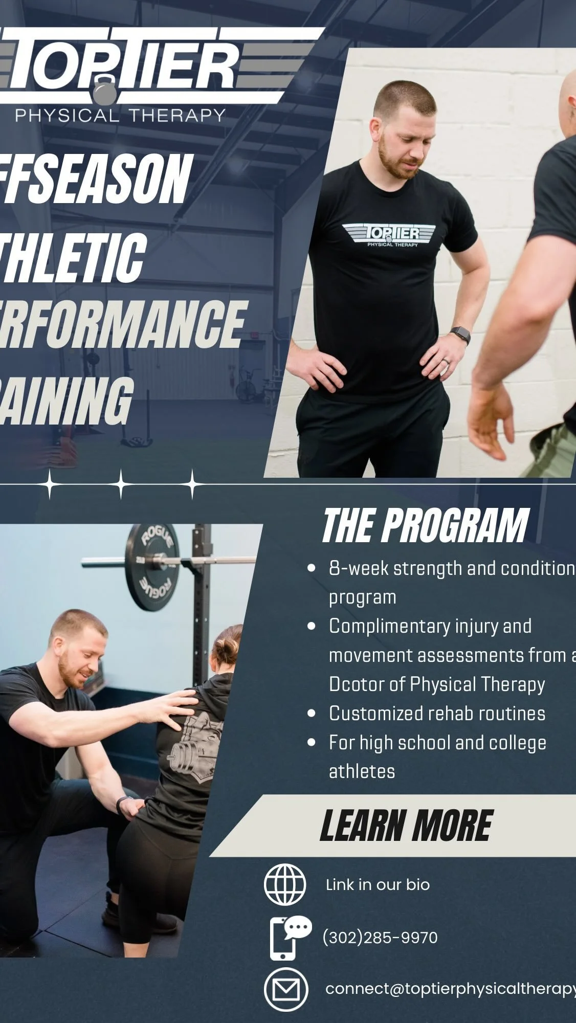 Top Tier Physical Therapy was established in 2022 with the aim of providing the highest of quality physical therapy-based services to athletes and active individuals who are dedicated to a healthy lifestyle and athletic performance. We believe that being physically active is essential to not only physical health but also mental health and are dedicated to providing the necessary care to support this lifestyle in the face of pain and injury.
